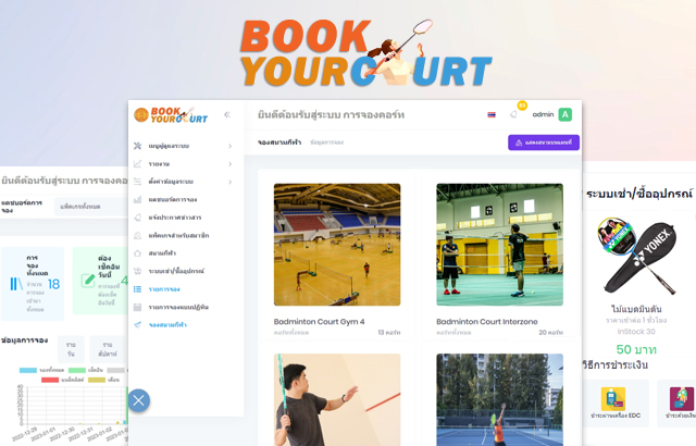 ระบบให้บริการรับจองสนามกีฬาแบบครบวงจร ทั้งสนาม Badminton สนามเทนนิส สนาม Squash ห้องคาราโอเกะและห้องซ้อมดนตรี มีการแบ่ง Slot ชั่วโมงให้เลือก มีการสร้าง Booking Code, QR Code ในการเช็คอิน รวมถึงระบบ Payment Gateway สำหรับสั่งซื้อแพ็คเกจการใช้บริการ ระบบบริหารจัดการข้อมูล ระบบรายงาน